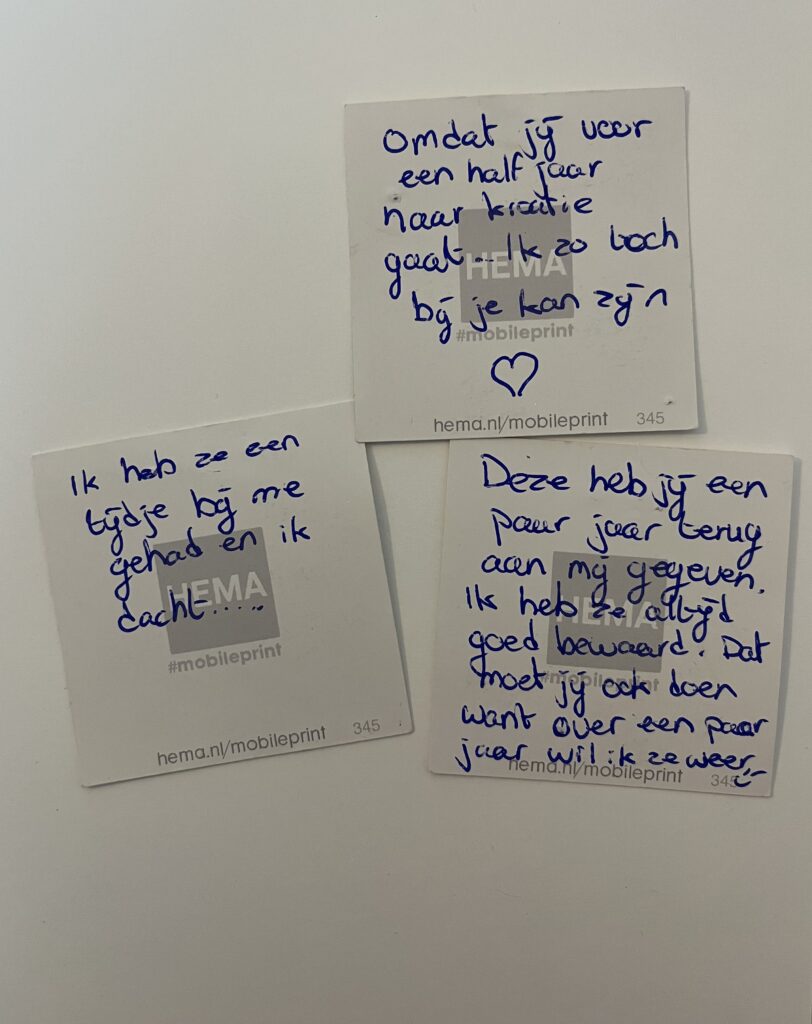 Ik neem de kaartjes mee naar Kroatië. Ze reizen met me mee, net als jij. Want ook al kan ik je niet meer de verhalen vertellen die ik ga meemaken, je bent nog steeds overal waar ik ben en kijkt met me mee. In de herinneringen, in mijn hart, in elk klein gebaar dat me aan jou doet denken.